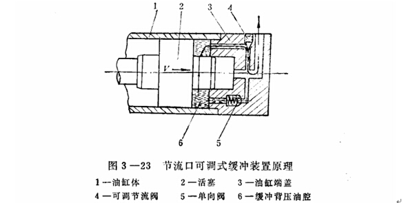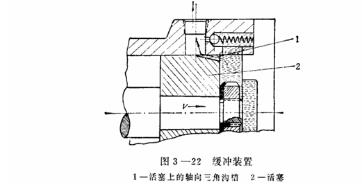 圖3-22是活塞頭部帶有軸向三角節(jié)流溝梢的緩沖裝置。當(dāng)活塞運(yùn)動到接近終點(diǎn)時(shí)將回油路封閉,油缸中剩下的油液只能通過三角狗槽流出,形成液壓阻力;钊酵耙,阻力越大,直至移動部件停止運(yùn)動。也有在油缸端部加可調(diào)節(jié)流間,使油缸中被封閉的油液經(jīng)可調(diào)節(jié)流閥口流出,這樣便可按負(fù)載慣性力大小適當(dāng)調(diào)節(jié)緩沖背壓,其工作原理示于圖3-23。