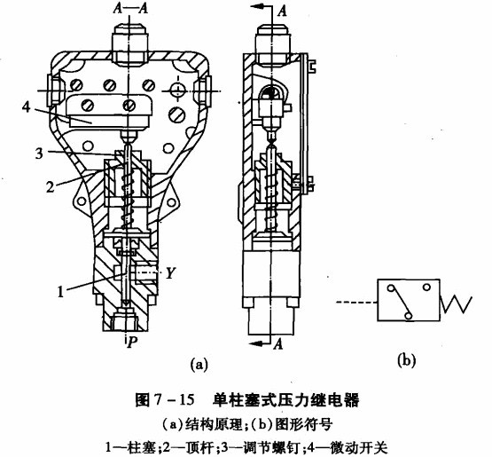 圖7 -15 (a)為單柱塞式壓力繼電器的結(jié)構(gòu)原理圖。壓力油從油口P進入,并作用于柱塞1的底部,當(dāng)壓力達到彈簧的調(diào)定值時,便克服彈簧阻力和柱塞表面摩擦力,推動柱塞上升,通過頂桿2觸動微動開關(guān)4發(fā)出電信號。圖7 -15(b)為壓力繼電器的圖形符號。